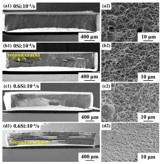 Fractographs at different strain rates, 10−1/s (a,c) and 10−4/s (b,d) for 0Si (a,b) and 0.6Si (c,d); macroscopic fractographs (a1,b1,c1,d1), and locally magnified fractographs (a2,b2,c2,d2).