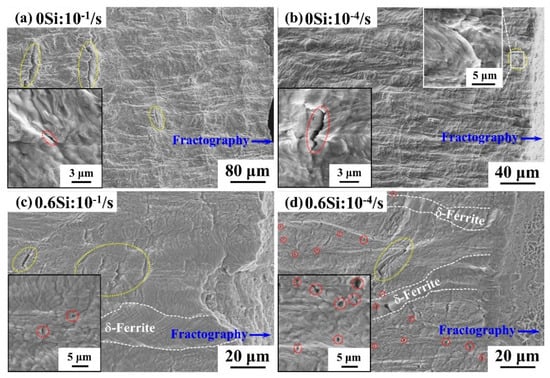 Figure 8 shows the cross-sectional (RD-TD) SEM images for both 0Si and 0.6Si at different strain rates. The specimens were directly etched after fracture. The image in the bottom left corner is a local magnification area. As shown in Figure 8a, 0Si consists of some large microcracks (yellow circles) vertical to the RD and a few small microcracks at the interface of γ(α′)/α-ferrite (red circles) at a strain rate of 10−1/s. As shown in Figure 8b, the number and size of large microcracks decrease (yellow circles that are magnified in the top right corner). However, small microcracks are similar to those of Figure 8a (red circles) when the strain rate is 10−4/s. The number of microcracks is considerably increased in 0.6Si compared with 0Si (Figure 8c,d). There are many large microcracks (yellow circles) with a few small microcracks (red circles) at a strain rate of 10−1/s (Figure 8c). As shown in Figure 8d, numerous small microcracks (red circles) with a few large microcracks (yellow circles) are noted at a strain rate of 10−4/s. Clearly, although the strain rate affected the relative number of large and small microcracks, the nucleation and propagation of microcracks are almost the same.