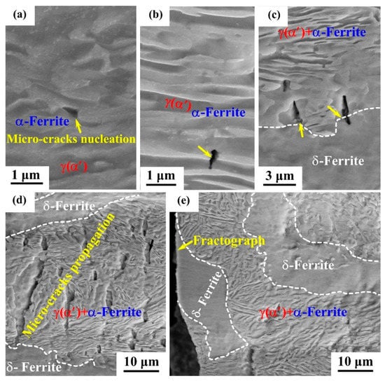 On the basis of these investigations, the cracking behavior and failure process of 0.6Si can be proposed as follows: (a) firstly, microcracks nucleate at the interfaces of γ(α′)/α-ferrite; (b) secondly, microcracks propagate in the phase of γ(α′) and α-ferrite; (c) thirdly, when the microcracks reach the soft δ-ferrite, the microcracks can be arrested; and (d) finally, the microcracks continue to accumulate and grow in the phase of γ(α′) and α-ferrite until propagating to the soft δ-ferrite. The repetition of this process contributes to the fracture of 0.6Si.