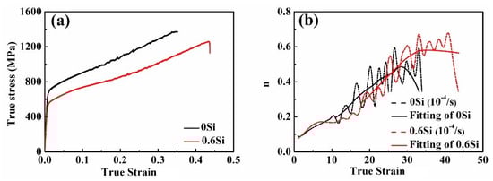 True stress vs. true strain (a) and the instantaneous hardening index (n) vs. true strain (b) in both 0Si and 0.6Si at a strain rate of 10−4/s.
