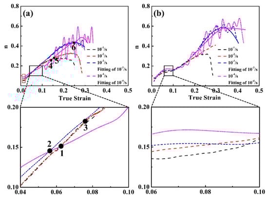 The relationship between the instantaneous hardening index (n) and the true strain at different strain rates of 0Si (a) and 0.6Si (b).