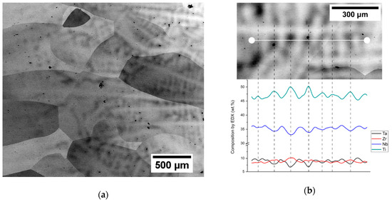 Figure 3a shows a SEM micrograph of the cast ingot. Very large grains with sizes over 1 mm are present in the material. Porosity appears as black spots with the size of 5–20 µm. In the right half of the image in Figure 3a (i.e., closer to the center of the cast ingot), there are dendritic chemical inhomogeneities, as proven by EDX line scan in Figure 3b. Darker areas are Ti and Zr enriched while lighter areas are Nb and Ta enriched. The compositional fluctuations around mean values are approximately 3%. The chemical inhomogeneity and porosity were located mainly in the central part of the cast ingot.