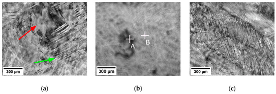 Micrographs of the rod forged with AR 40% showing distinct features: (a) non-deformed area (denoted by red arrow) and dendritic inhomogeneity (denoted by green arrow); (b) local chemical inhomogeneity; (c) grain deformed by slip in parallel directions. Dendritic inhomogeneities can be observed in all micrographs.