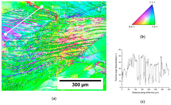 In order to examine the origin of parallel bands in Figure 4c in detail, the EBSD inverse pole figure (IPF) map of the central part of forged rod with the AR 40% is shown in Figure 5a, along with orientation triangle (Figure 5b) and misorientation profile (Figure 5c) along a line drawn in white in the IPF map. The misorientation profile shows that the misorientations between two grains never exceeds 40°. The misorientation angles of twins occurring in β Ti are 60° in case of {112} <111> twinning and 50.57° for {332} <113> twinning []. Therefore, the parallel bands that are intersecting each other are slip bands formed by dislocations. Apart from dislocation bands, significant lattice rotation within the original large grains was observed.