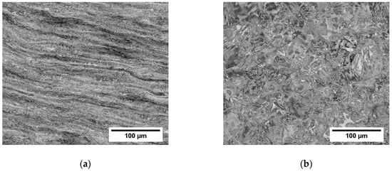 In Figure 6a,b the grain structure of the middle and the side of the forged rod with AR 70% are compared (both cross-sections studied showed similar microstructures in their centers and closer to their surfaces, but the middles and sides of the forged rods differ significantly). The microstructure is heavily deformed, as indicated by the channeling contrast of BSE. Due to the high deformation, it is difficult to recognize the individual grains in Figure 6a or Figure 6b. The layered structure observed in the middle part of the rod (Figure 6a) is caused mainly by elongation of grains. The observed contrast is, however, also caused by elongated areas of chemical inhomogeneities (varying Nb content).