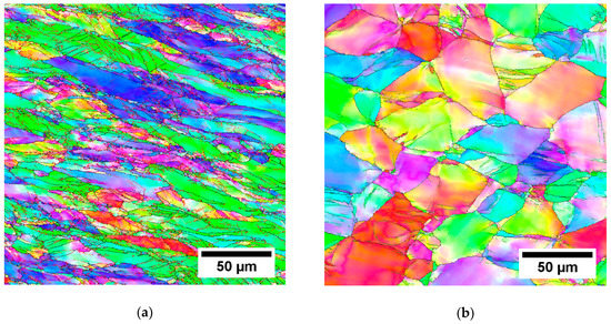 The GOS was computed for each grain as a mean deviation of crystalline orientations in the grain from the average grain orientation []. In other words, high GOS means that the grain is significantly deformed, and vice-versa: low GOS represents grains with a low deformation—for instance, recrystallized (RX) grains. GOS is normalized to the grain size; i.e., low GOS values are not caused by the small size of grains. The threshold between the GOS values of RX and non-RX fractions was determined on the basis of the histogram of GOS values (not-shown) as 1°, which is a common choice for β-Ti alloys []. GOS maps are only shown for centers of each rod as the edges did not contain recrystallized grains with low GOS values.