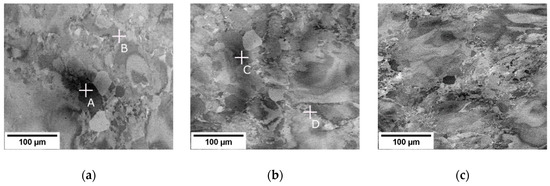 BSE images of the three hot rolled rods from the centers of the cross-sections are shown in Figure 8. Similarly to the forged rods, no porosity was found in the hot rolled rods. The refinement of microstructure increases with the increasing area reduction, as can be observed mainly by comparing Figure 8a,c. The dark shades in Figure 8a,b are chemical inhomogeneities from casting that were distorted by the rolling procedure, as proven by EDX point analysis of points A, B, C and D, as summarized in the Table 3. Large deformed grains and new small grains can be distinguished in Figure 8, EBSD measurements were performed for a detailed inspection.