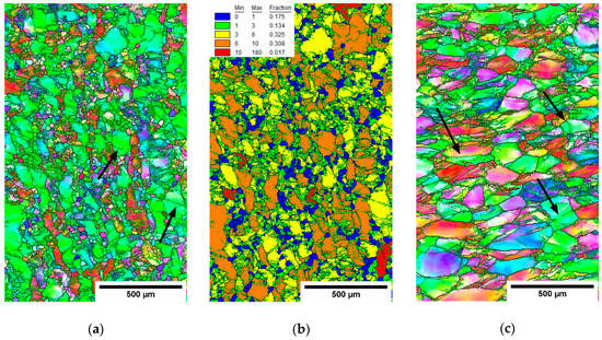 It is clear from the EBSD images that with the increasing area reduction, the fraction of recrystallized (RX) grains (size of 20–30 µm) increased. New small grains were formed in the areas with higher deformation; namely, at the grain boundaries. This resembles a so-called necklace continuous recrystallization reported in []. The recrystallized grains evolve during multiple heating and deformation. Note that there is the lowest RX fraction in the condition with AR of only 64%, which was not reheated. However, the deformed grains also have a smaller size in the rods with higher AR. This can be associated with continuous dynamic recrystallization, which is supported by several incomplete low-angle grain boundaries (marked by black arrows in IPF images), that separate sub-grains.
