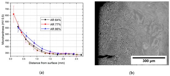 The microhardness of the hot rolled rods near the surface, was much higher than in the bulk, as shown in Figure 12a. Microhardness decreases with increasing distance from the surface for all hot-rolled conditions. In the closest vicinity to the surface, the microhardness exceeds 550 HV, and this value decreases with the increasing distance from surface to the value of 340 HV at 1.7 mm below the surface. The reason for this behavior was undoubtedly the increased oxygen content during exposure to air during the rolling process, which took several hours. Oxygen increases hardness, causes embrittlement in titanium [] and also stabilizes the α phase. As shown in the Figure 12b, both the α phase precipitation and cracking were observed in the surface region of the condition hot rolled to AR 86%. Note that the α phase precipitates only to a depth of approximately 0.5 mm, while the layer with increased hardness—presumably increased oxygen content—is thicker. The clear practical implication of this behavior is that long-term exposure of the material to air at high temperature should be avoided. For instance, the hot die-forging process descried above was designed to limit the time of exposure to high temperatures.