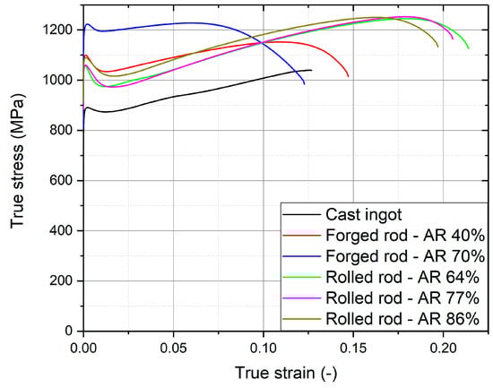Flow curves from static tensile tests are shown in Figure 13 for all manufactured conditions. Three or four samples were measured for each condition, and representative flow curves (with yield stress, ultimate tensile strength and ductility closest to the average) are shown. Tensile parameters, namely, the yield strength, the ultimate tensile strength and the total plastic elongation, derived from the flow curves, are summarized in Table 5. Extensometer was not used in the measurements and flow curves were determined only from the movement of the cross-head. Elastic parts, were thus subtracted from the true stress–true strain curves to obtain flow curves.
