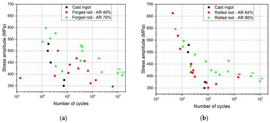 The S–N plots of fatigue tests in tension-compression (R = −1) are shown in two separate graphs for better orientation. Figure 14a shows results from the forged rods compared to the cast condition, while Figure 14b shows results from the hot rolled rods compared to the cast condition. Fatigue properties of the rod rolled to AR 77% were not determined due to insufficient amount of material. In addition, stress amplitude lower than 350 MPa was not used for testing since lower stress amplitudes are not relevant for the foreseen application—manufacturing of the stem of the hip implant.