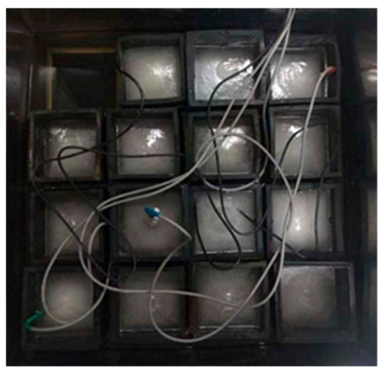 The frost resistance test was conducted abiding by the GB/T 50082-2009 standard for test methods of long-term performance and durability of ordinary concrete [43]. Specimens with a size of 100 mm × 100 mm × 400 mm were used. The core temperature of specimens was kept at (−18 ± 2) °C and (5 ± 2) °C during freezing and thawing. The water surface in the container was at least 5 mm above the specimen surface. Relative dynamic modulus and mass loss were measured for specimens subjected to freezing and thawing for 0, 25, 50, and 75 cycles, respectively, with the use of Equations (1) and (2). The average value of three specimens was adopted. The lab photo of the frost resistance test is shown in Figure 2.