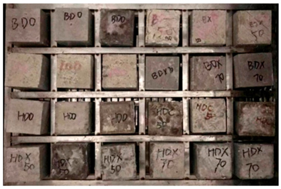 The carbonation resistance test was conducted abiding by the GB/T 50082-2009 standard for test methods of long-term performance and durability of ordinary concrete [43]. Cubic specimens (100 mm × 100 mm × 100 mm) were first dried in an oven at 60 °C for 3 d; then five surfaces of each specimen were sealed with paraffin. The specimens were placed in an accelerated carbonation chamber with the CO2 concentration at (20 ± 1)%, relative humidity at (70 ± 5)%, and the temperature at (23 ± 2) °C. It should be noted that the distance between specimens should be larger than 50 mm to guarantee all the specimens have the same boundary conditions. The lab photo of the carbonation resistance test is presented in Figure 3. The carbonation depths were measured after 3 days, 7 days, 14 days, and 28 days of exposure, based on which carbonation rates were calculated.
