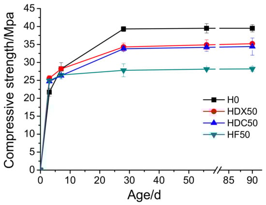 Figure 4 shows the impact of curing time on the compressive strength of RAC. One representative mixture of each RAC series was chosen for analysis: HDX50, HDC50, and HF50. It can be observed that the compressive strength of all concrete increased rapidly before 28 days, slowed down afterwards, and stabilized after 56 days. Additionally, the compressive strength of 28 days of all the specimens reached more than 90% of that of 90 days. Moreover, it can also be found that, consistent with the findings of many previous researches [10,11,12,13,14], the incorporation of RA decreased the compressive strength of concrete. Furthermore, the compressive strength reduction of concrete mixed with single RCA was greater than that mixed with single RFA. Furthermore, concrete with both RCA and RFA had the lowest compressive strength, particularly after 10 days of hydration.