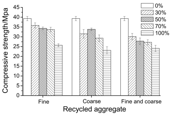Moreover, it can be seen from Figure 5 that when the RFA dosage was lower than 70%, the compressive strength of specimens was higher than 32.5 MPa and the drop degree was within 15%, which was superior to that of RFA concrete in other studies [9,11,14]. Furthermore, the compressive strength reduced to less than 30 MPa when the dosage of RCA, mixed RCA and RFA, reached 70%, which is significant and coincides with the findings in other studies [7,8,11]. It can also be observed from Figure 5 that the compressive strength of HDC50 did not conform with the regular law of compressive strength, changing with RCA content. This can be attributed to the variations in the composition of RA. The abnormity was acceptable considering the test uncertainties.