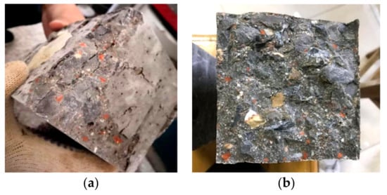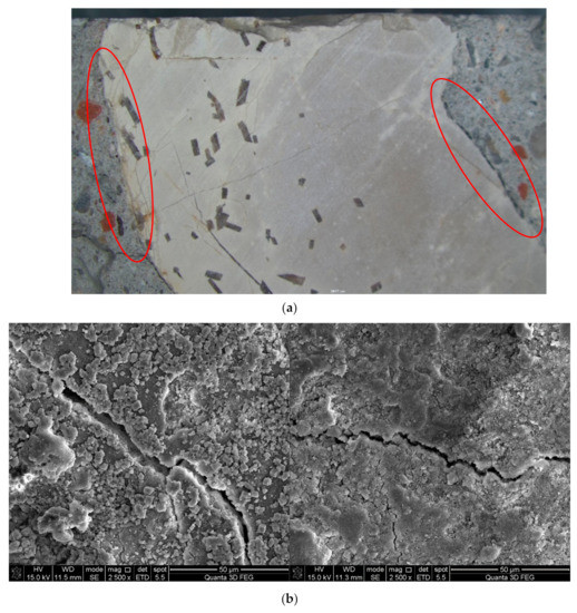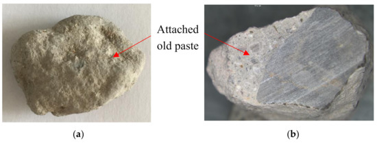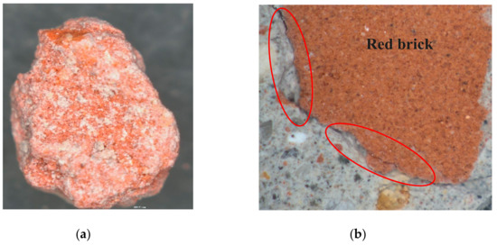 As for the inherent defects of RA, Figure 11 provides the macro-appearance of NA and RA for comparison. It can be observed that NA has dense and hard texture (Figure 11a) with no visible cracks, whereas RA is porous and loose (Figure 11b) with a number of micro-cracks (Figure 10a). Therefore, the RA breaks easily under force, which decreases the mechanical performances of concrete. Furthermore, the existence of red brick particles also has a negative impact on the mechanical performances of concrete. As shown in Figure 12, red brick is porous and has low strength by itself, and its binding with paste is also weak.