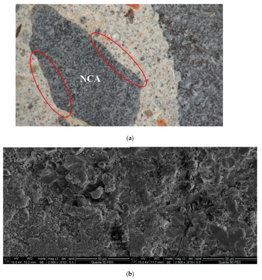 Based on the above, it can be found that there have been a number of studies about RAC, and almost all of them indicate that the properties of RAC are generally poorer than that of NAC. A few contradictory findings are mainly caused by the different material properties of RA, which can be further traced back to the sources and locations, mix proportions, impurities, such as red block residues and soil, and the service history. All the differences mentioned above make the microstructure of the interface transition zones (ITZ) between the RA and the new cement paste and the RA and the old mortar differ a lot and are very complicated [37,38], which greatly influences the performance of RAC.