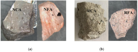 Macroscopic appearance of recycled aggregates: (a) Coarse aggregates (b) fine aggregates.