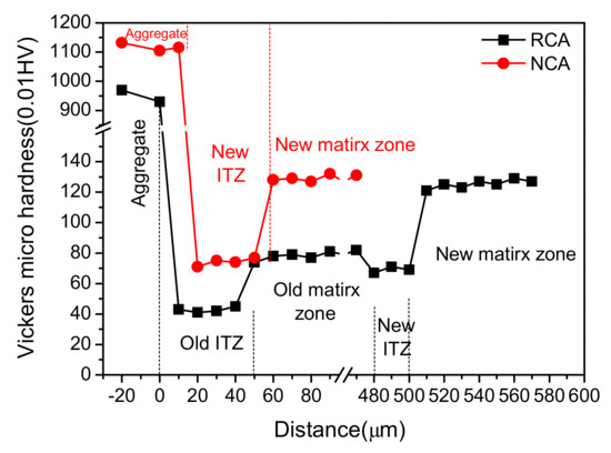 Figure 13 presents the Vickers hardness of the matrix zone and ITZ around NCA and RCA in H0 and HDC50. The hardness curve of NCA includes three parts: the coarse aggregate, new ITZ, and new matrix zone, while that of RCA includes five parts: the coarse aggregate, old ITZ, old matrix zone, new ITZ, and new matrix zone. It can be found that the hardness of ITZ was the lowest, then that of the matrix zone, with the hardness of aggregate being the highest, which further demonstrates that ITZ was the weakest region of concrete. Moreover, the hardness of the new matrix zone in RAC was close to that of NAC, and that of new ITZ in RAC was a little smaller than that in NAC. Hence, compared with NAC, the poorer performances of RAC should not be ascribed to the new ITZ and the new matrix zone. Furthermore, it can be seen that the hardness of the old ITZ was the lowest, and the hardness of the old matrix zone was obviously lower than that of new matrix zone in NAC at the same distance from the aggregate. The range of the old matrix zone was wide (about 420 µm from the aggregate for the tested sample), owing to the RCA adopted. Therefore, it can be concluded that the poor performances of RAC was mainly related to the weakness of the old ITZ and the old matrix zone.