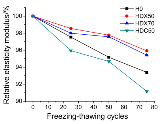 - Considering the combination of the appearance, mass loss, and relative elasticity modulus situations of specimens after freeze-thawing cycles, HDX50 possessed the best frost resistance performance, followed by HDX70 and HDC50, successively. Improvement on the relative elasticity modulus of HDX50/HDX70 was observed, compared to NAC.