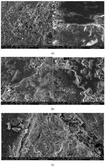 It can be observed from Figure 11 that RFA had many pores that could alleviate expansion stress. In Figure 10, it is clear that RCA had many fissures that broke easily during frost heaving, leading to the degradation of all the performances of specimens after freeze-thawing cycles. Moreover, Figure 16 shows the ITZ of H0, HDX50, and HDC50 after 50 cycles. It can be observed that the ITZ of HDC50 had more defects than that of H0 and HDX50, which made it more fragile. Therefore, the frost resistance of HDC50 was the worst since it had more inherent defects and no alleviation capability and inner curing effect like RFA. In addition, comparing the ITZ of NAC and RAC before (see Figure 9b and Figure 10b) and after (see Figure 16) subjected to freezing and thawing, it can be found that both the ITZ of NAC and RAC had more defects after freeze-thawing, which was one of the major reasons for the degradation of the concrete.