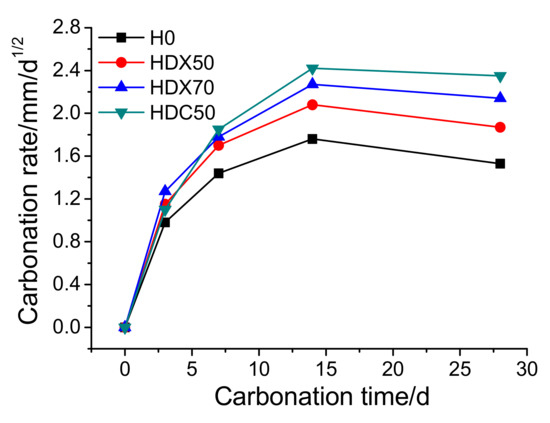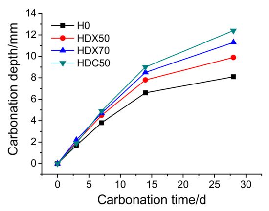 The development of carbonation depth of specimens is shown in Figure 17. It can be observed that the carbonation depth of all specimens increased with exposure time. The carbonation depth of RAC was higher than that of NAC, which can be attributed to the larger number of channels for CO2 infiltration provided by the micro-cracks and large porosity of RA. The carbonation depth of HDC50 with RCA was the highest, reaching 12.4 mm at 28 days, and that of H0 at 28 days was 7.2 mm, the former of which was 1.7 times higher than the latter, and lower than that the result (2.5 times) of Silva et al. [27]. This demonstrates that RAC in this study had a better carbonation resistance. This is closely related to the actual RA content of RAC; the higher the actual RA content, the more channels for CO2 infiltration, leading to a more severe carbonation degree. Moreover, since specimens mixed with RFA possess certain inner curing capacities, the hydration degree was more adequate compared with that of specimens mixed with RCA, and the matrix of RFA was denser, which made CO2 infiltration harder. In addition, RFA contained more pastes, which can consume more CO2 compared with RCA. These two factors lead to the result that the carbonation depth of RFA concrete was lower than that of RCA concrete.