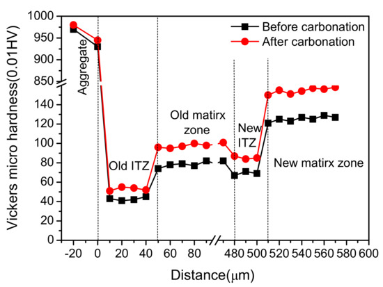 Figure 18 presents the carbonation rate of specimens at different carbonation times. It can be found that the carbonation rate of specimens first increased rapidly, then stabilized and decreased slightly. During carbonation, the products insoluble in water gradually formed and filled in the pores in concrete and densifies its microstructure, which cut off the channels for CO2 infiltration, mitigating the following carbonation reaction, and thus slowed down the carbonation rate. As is shown in Figure 19, the micro-cracks and voids around ITZ were filled in gradually after carbonation, blocking the further infiltration of CO2. Moreover, the Vickers hardness of the ITZ and matrix zone around RA in HDC50 after carbonation is shown in Figure 20. It can be observed that the Vickers hardness of the old ITZ, old matrix zone, new ITZ, and new matrix zone after carbonation all increased significantly, suggesting that the ITZ became stiffer and carbonation improved the performance of RAC. Furthermore, with the distance to RA surface expanding, the increase of Vickers hardness multiplied gradually, revealing that the closer to RA surface, the harder the CO2 infiltration, and the weaker the carbonation degree. In addition, the carbonation rate of RAC was significantly higher than that of NAC, with HDC50 being the fastest, followed by HDX70 and HDX50, successively.