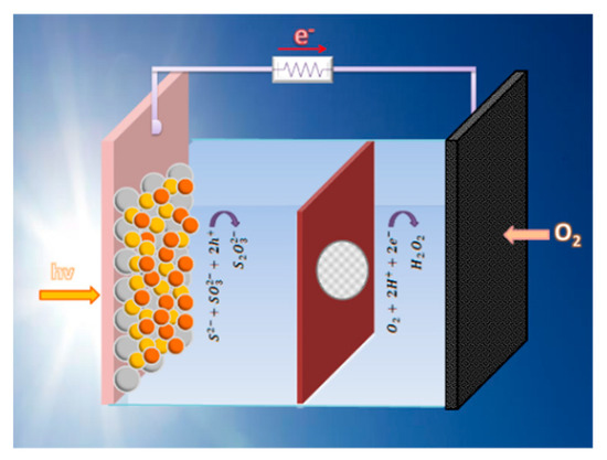 The purpose then of the present work is to study the production of hydrogen peroxide by means of photoelectrocatalysis. To this goal, we have used a photoelectrochemical cell employing a photoanode carrying visible–light–sensitized nanoparticulate titania. These cells work as self-running Photo(catalytic) Fuel Cells (PFC), operating without external bias by photocatalytically oxidizing a fuel, which may as well be a waste. This offers a double environmental benefit and ensures sustainability. Hydrogen peroxide has been produced by atmospheric oxygen reduction. The photoanode produced the current while an air–breathing cathode produced hydrogen peroxide. This is schematically represented in Figure 1, while details are discussed in the following sections.