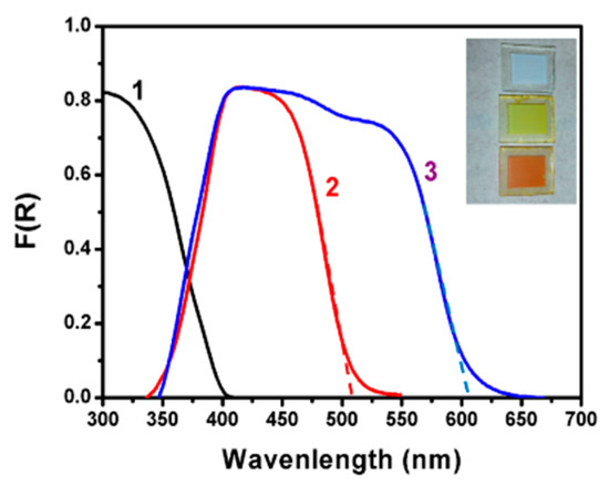 Reflection absorption spectra of various photoanode electrodes: (1) TiO2/FTO; (2) CdS/TiO2/FTO; and (3) CdSe/CdS/TiO2/FTO. In curves (2) and (3), the background including titania absorption has been subtracted for better presentation of the spectra. The tangential dashed lines give the average value of the band gap, i.e., 510 nm (2.43 eV) for the CdS/TiO2/FTO film and 610 nm (2.03 eV) for the CdSe/CdS/TiO2/FTO film. Insert: Film photographs.