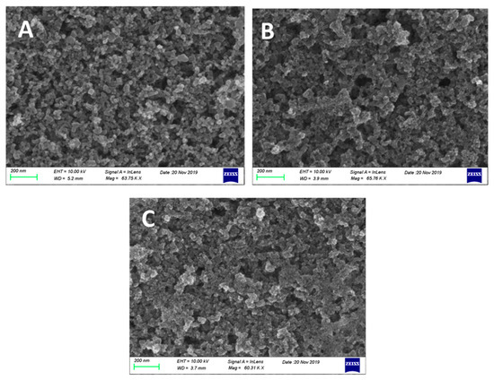 CdS and CdSe nanoparticles were synthesized, as explained in the Experimental section, by reaction of Cd2+ cations with S2− anions within the pores of the mesoporous titania film. For this reason, they do not form separate layers, but they are detected inside the titania mesostructure. This is known from previous works [7,8,15,17,35,36], but can be also verified by the following FESEM images shown in Figure 3. Figure 3A shows a characteristic image of nanoparticulate Titania P25. TiO2 nanoparticles range in sizes around 20–30 nm. Careful observation and comparison of the three images shows the formation of new species within the mesoporous titania structure in going from pure titania to CdS/TiO2 (Figure 3B) and then to CdSe/CdS/TiO2 (Figure 3C). CdS and CdSe particles grow in much smaller sizes ranging below 10 nm. This intercalated formation of the chalcogenide semiconductors ensures close proximity between nanoparticles and subsequently efficient sensitization and charge carrier mobility. Some protective role of titania on chalcogenide nanoparticles cannot be excluded either.