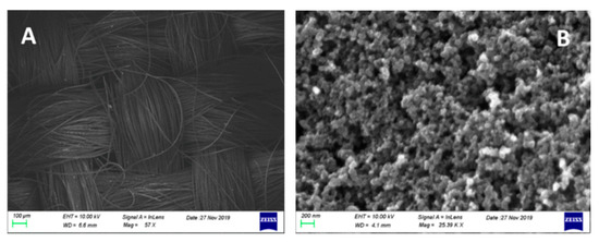 FESEM images of the carbon cloth (A) and the carbon black film (B). The scale bar is 100 μm and 200 nm, respectively.