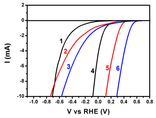 Polarization curves for an electrode made of carbon cloth alone (1,2,3) or carbon cloth carrying carbon black (4,5,6) in various 0.5 M aqueous electrolytes: (1,4) H2SO4; (2,5) Na2SO4; and (3,6) NaHCO3. A Pt foil was used as counter and an Ag/AgCl as reference electrode.