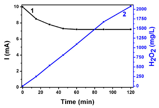 Evolution of the short-circuit current (1) and of the quantity of photoelectrochemically produced H2O2 (2) using a PFC operated with a ternary semiconductor photoanode. Anode electrolyte: Aqueous 0.25 M Na2S + 0.125 M Na2SO3. Cathode electrolyte: Aqueous 0.5 M NaHCO3.