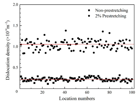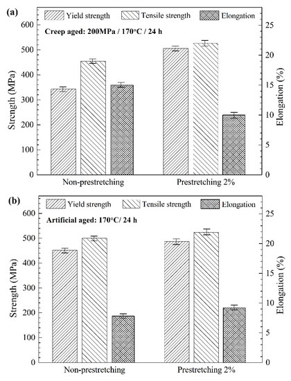- The strength property of the pre-stretched Al-Cu-Li alloy specimen is much higher than the non-pre-stretched one after the same creep aging treatment. In contrast to the artificial aging process, the strength increase appears much larger, as the yield strength rises by 47%. The strength property of the non-pre-stretched Al-Cu-Li alloy specimen was significantly decreased by the creep aging process, but the room-temperature mechanical property of the creep-aged specimens with 2% pre-stretching is very close to the artificially aged specimens, and even slightly higher than the latter.