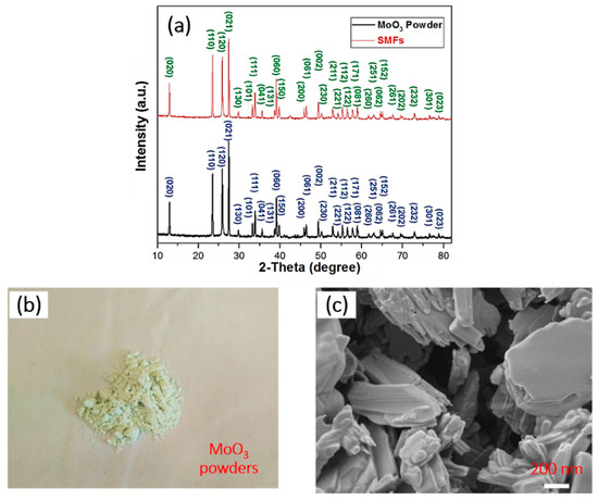 (a) The typical XRD spectra of the MoO3 powders and SMFs, the optical photograph (b) and FESEM image (c) of the schistose MoO3 powders.