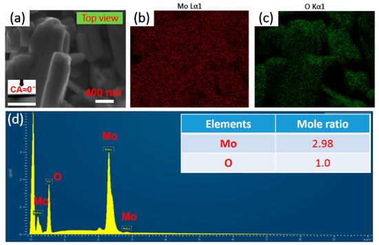 (a) The top-view images of samples before surf ace modification. Following are the elemental distributions of (b) Mo and (c) O, and the EDX spectrums (d) of the samples.