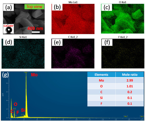 (a) The top-view images of SMFs. Following are the elemental distributions of (b) Mo, (c) O, (d) Si, (e) C and (f) F and the EDX spectrums (g) of the samples. The entire region in the top-view image is the elemental mapping region.