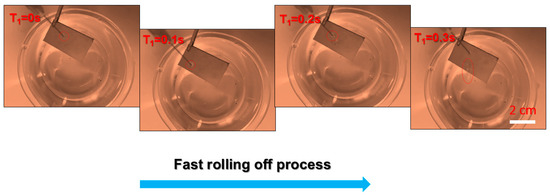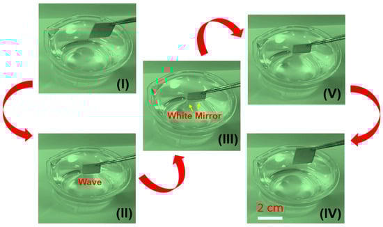 The wettability of SMFs is systematically studied for analyzing their anti-wetting performance. As shown in Figure 4a, the contact angle of samples before modification treatment is close to 0° by using a water droplet (V = 10 μL), indicating the superhydrophilic material. However, after modification process, it is quite difficult to place the droplet on the modified samples due to droplets rolling down quickly. The SMFs show great anti-wetting properties with an apparent contact angle of 169 ± 1° and a rather small roll angle of <1 ± 1°, which means the SMFs belong to superhydrophobic materials [33,34,35]. The droplet approximates a sphere (Figure 5a) in the typical Cassie state [36], indicating the outstanding anti-wetting properties of product. Furthermore, Figure 6 shows the dynamic soaking process of SMFs into water, including five steps of falling (I), contacting (II), soaking (III), rising up (IV) and departing (V). Clearly seen step II in Figure 6, when the SMFs contacts with the water, distorted water ripples appear, due to the water-proof characteristic of SMFs, pushing the water away in an interesting way. Notably, when samples is immersed into the water, it appears as a silver-white mirror, which is consistent with reported by Larmour group [37]. The high absolute reflectivity and mirror-like appearance is because of an air layer between the sample surface and water. The SMFs are always dry after immersion experiments, which is also demonstrated in Video SI in Supporting Information. Moreover, the water droplet can roll off quickly with a contact time of less than 0.3 s when placed on SMFs’ surface with a negligible angle or an almost flat state, clearly seen in Figure 7. The corresponding whole video is displayed in Video SII in Supporting Information.