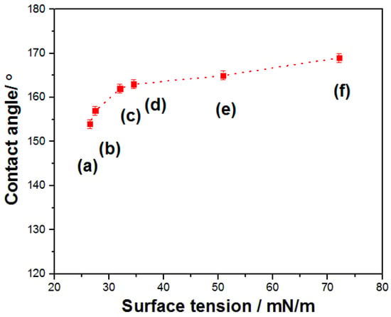As we all known, all materials will contact with different kinds of external environments in practical fields. Furthermore, in order to verify the practicality of SMFs, droplets ((a) tetradecane, (b) hexadecane, (c) olive oil, (d) peanut oil, (e) diiodomethane, and (f) water) with different surface tensions are used to investigate wettability of products. Figure 8 shows the contact angle of SMFs as a function of droplets with various surface tensions. Clearly, contact angle gradually decreases as the surface tension becomes larger. When the drops with organic liquid are placed on the surface of SMFs, the apparent contact angle changes from 166° for diiodomethane to 154° even for tetradecane with surface tension of ca. 26 mN/m, indicating the outstanding anti-wetting properties of product.
