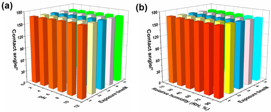 The contact angle as functions of (a) pH and exposure time and (b) relative humidity and exposure time, respectively.