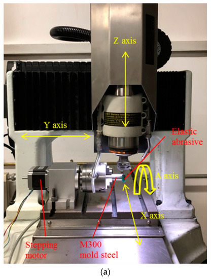 The experiments were carried out on 4-axis precision Computer Numerical Control (CNC) machine tool Mikoni430P, which is produced by LuoYang Mikoni Precision Machinery Co., Ltd., LuoYang, China. The device includes three moving axes X, Y and Z (the repeated positioning accuracy is 1 μm), and a rotation axis, A. The polishing experimental platform is shown in Figure 1a.