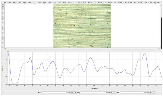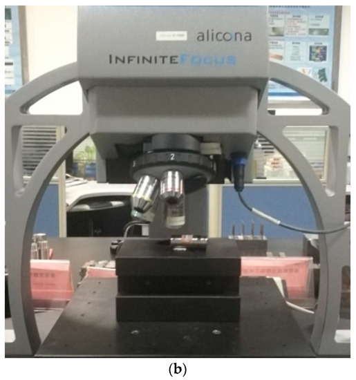 The surface quality of the workpiece and abrasive is measured by an Alicona INFINITE Focus three-dimensional (3D) profilometer, as shown in Figure 1b. This equipment is produced by Alicona, Austria. The magnification and the size view of the lens, which is applied for specimen measuring, are 100×/0.6 and 285.0027 µm × 216.2089 µm. The parameter settings for abrasive measuring are 20×/0.4 and 713.7553 µm × 541.4695 µm, respectively. The high pass filter is Gaussian filtering. The experiments are carried out three times to reduce the influence of random factors. When the workpiece is rotated in the YOZ plane, the polishing trajectory is strictly center symmetrical [14]. However, the workpiece in this experiment only rotates in the XOZ plane, which causes the cutting of abrasive grains mainly in the horizontal direction. Thus, the roughness (Ra) is measured along with the axial direction of the workpiece.