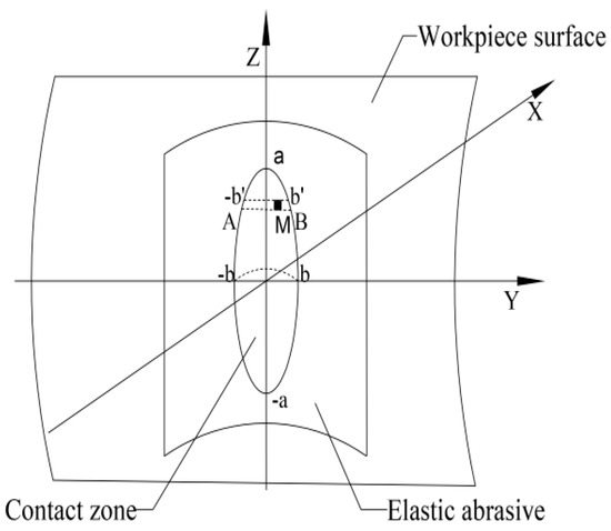 According to the Hertz Contact Theory, the polishing process can be simplified as the contact situation between the rigid body (workpiece) and the elastic body (abrasive). The contact surface between the workpiece and abrasive tool is ellipse as shown in Figure 2. The contact pressure submits to Elliptical Hertz distribution [17]: