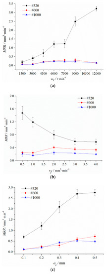 In Figure 4a, the MRR of the #320 grinding tool is approximately proportional to the grinding speed (Wt), which is consistent with the material removal model, and the rate of increase is gradually slowing down at 9000 r/min. The MRR of #600 and #1000 reached the peak at 6000 r/min and 9000 r/min, respectively. Then the MRR begins to decrease. Due to the contact time between the workpiece and the larger abrasive being too short with the increase of Wt and the sliding and ploughing effect being more important than the cutting effect, the removal ability of the abrasive decreased.