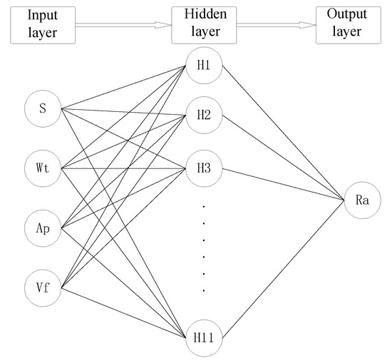 Particle size (S), rotational speed (Wt), cutting depth (Ap) and feed speed (Vf) are input factors. The polishing surface roughness is used as the output factor. The BP neural network model with one hidden layer is established, as shown in Figure 7. The number of neurons in the hidden layer is 11. The transfer function of the hidden layer is “tansig”. The transfer function of the output layer is “pureline”. The training function is “trainlm”. The training accuracy, learning rate and cycle times are 0.0001, 0.05 and 3000, respectively.