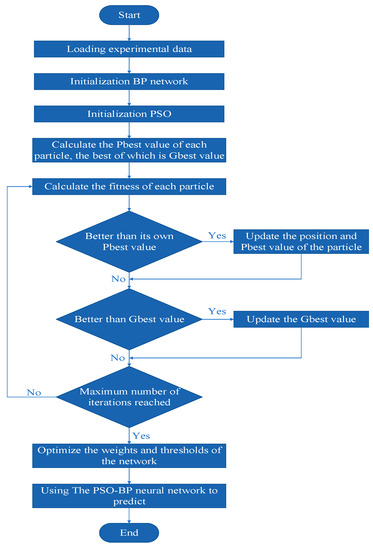 Flow-process diagram of the particle swarm optimization algorithm optimized with the back propagation neural network algorithm (PSO-BP).