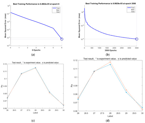 Compared with Figure 9a and Figure 9b,e, it can be seen that the PSO-BP neural network converges to the preset precision in only six steps, and the efficiency of the PSO-BP neural network is obviously improved compared with the basic BP neural network. By comparing Figure 9c with Figure 9d, the predicted value of the former is very close to the experimental value, but the latter has a large deviation.