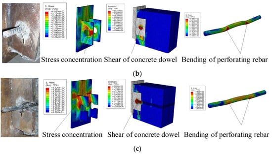 - The push-out failure modes of perfobond shear connectors with circular and notched holes are characterized by crack in the concrete slab, yield of the perforating rebar and shear failure of the concrete dowel. The concrete crack initially occurs near the perfobond shear connectors and spreads out across the concrete slab. The rebar in the hole yields at the locations of perforation due to large deformations. The concrete dowels in the hole fails in shear. There is no obvious deformation in the conventional perfobond rib. In comparison, the notched perfobond rib deforms with the cut width increased.