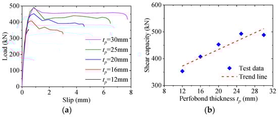 Figure 15 shows the effect of the perfobond thickness on the load–slip behavior of the notched perfobond shear connector. When the thickness of the perfobond rib was increased from 12 mm to 16 mm, 20 mm, 25 mm and 30 mm, the shear capacity increased by 15%, 28%, 39% and 38%, respectively. This indicated that the increase of the perfobond thickness would lead to an increase in the shear capacity of the notched perfobond shear connector. The main reason was that increasing the thickness of the perfobond rib increased the cross-sectional area of the steel stem, which resulted in greater shear capacity of the notched perfobond shear connector.