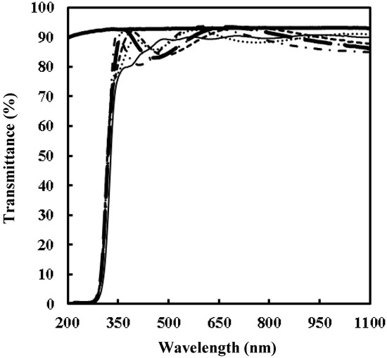 Transmittance spectra of precursor film F0, ultraviolet (UV)-irradiated films Fx, and quartz glass substrate applied. Air was used as the reference. The lines represent quartz glass substrate (━), F0 (—), F1 (…), F2 (---), F4 (- -), F8 (-⋅-), and F16 (-⋅⋅-).
